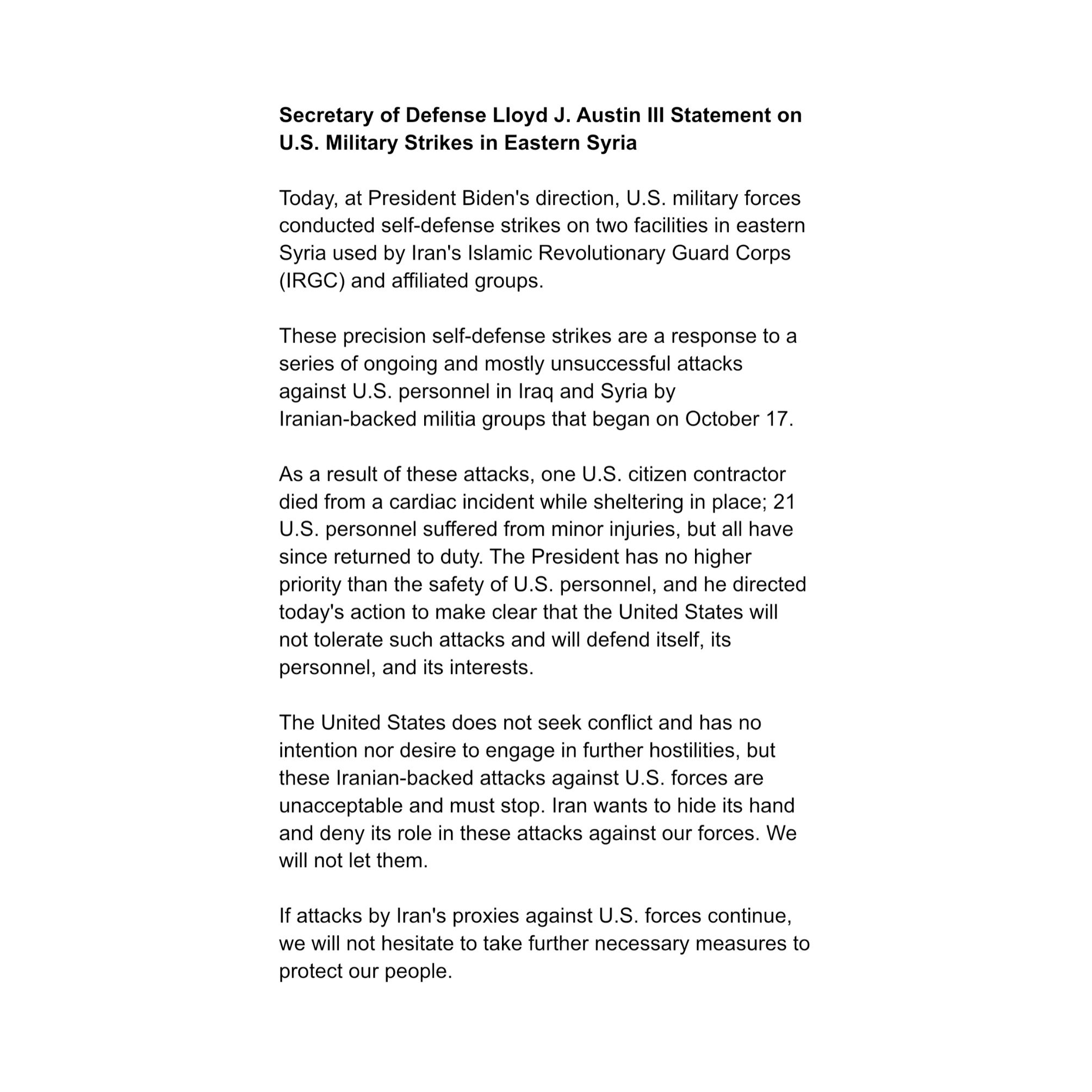 “Today, at President Biden’s direction, US military forces conducted self-defense strikes on two facilities in eastern Syria used by Iran’s Islamic Revolutionary Guard Corps (IRGC) and affiliated groups. These precision self-defense strikes are a response to a series of ongoing and mostly unsuccessful attacks against US personnel in Iraq and Syria by Iranian-backed militia groups that began on October 17. As a result of these attacks, one US citizen contractor died from a cardiac incident while sheltering in place; 21 US personnel suffered from minor injuries, but all have since returned to duty. The President has no higher priority than the safety of US personnel, and he directed today’s action to make clear that the United States will not tolerate such attacks and will defend itself, its personnel, and its interests. The United States does not seek conflict and has no intention nor desire to engage in further hostilities, but these Iranian-backed attacks against US forces are unacceptable and must stop. Iran wants to hide its hand and deny its role in these attacks against our forces. We will not let them. If attacks by Iran’s proxies against US forces continue, we will not hesitate to take further necessary measures to protect our people” – Statement from Defense Secretary Lloyd Austin on the Air Force pew-pewing some Iranian-backed bad guys.