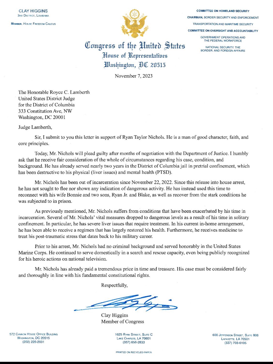 “As previously mentioned, Mr Nichols suffers from conditions that have been exacerbated by his time in incarceration. Several of Mr Nichols’ vital measures dropped to dangerous levels as a result of his time in solitary confinement. In particular, he has severe liver issues that require treatment. In his current in-home arrangement, he has been able to receive a regimen that has largely restored his health,” and blah blah blah writes MAGA Louisiana Congressman Clay Higgins to DC Circuit Judge Royce Lamberth pleading the jurist to have mercy on the soul of Capitol rioter Ryan Nichols.