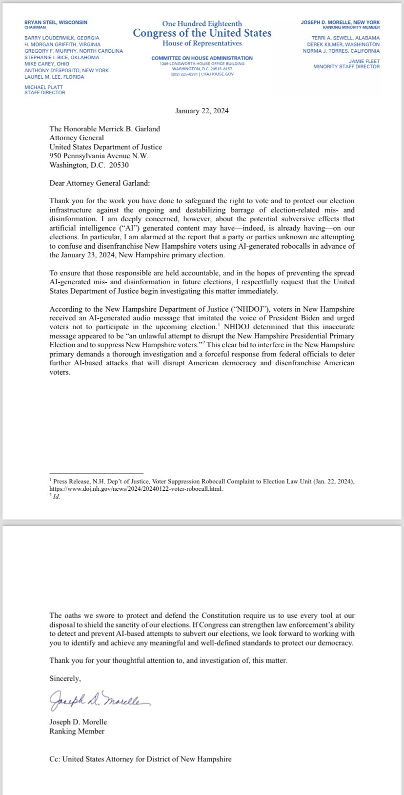 “In particular, I am alarmed at the report that a party or parties unknown are attempting to confuse and disenfranchise New Hampshire voters using Al-generated robocalls in advance of the January 23, 2024, New Hampshire primary election. To ensure that those responsible are held accountable, and in the hopes of preventing the spread Al-generated mis- and disinformation in future elections, I respectfully request that the United States Department of Justice begin investigating this matter immediately. According to the New Hampshire Department of Justice (‘NHDOJ’), voters in New Hampshire received an Al-generated audio message that imitated the voice of President Biden and urged voters not to participate in the upcoming election. NHDOJ determined that this inaccurate message appeared to be “an unlawful attempt to disrupt the New Hampshire Presidential Primary Election and to suppress New Hampshire voters. This clear bid to interfere in the New Hampshire primary demands a thorough investigation and a forceful response from federal officials to deter further Al-based attacks,” writes spandex-wearing grapple freak Jim Jord-