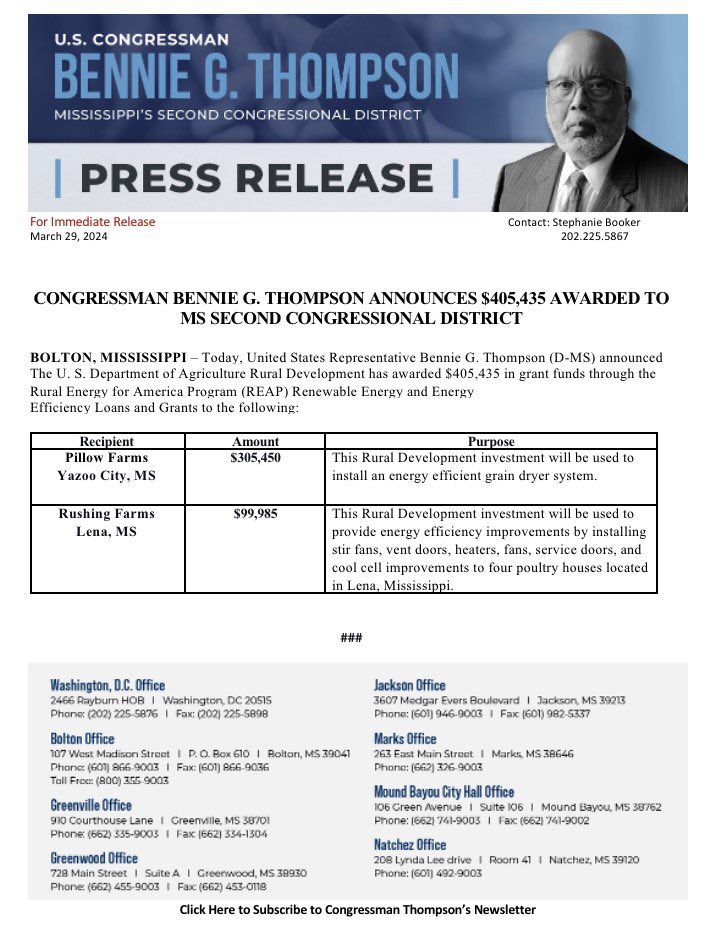 Pillow Farms in Yazoo City, Mississippi will recieve $305,450 “to install an energy efficient grain dryer system,” while Rushing Farms in Lena will get $99,985 “to provide energy efficiency improvements by installing stir fans, vent doors, heaters, fans, service doors, and cool cell improvements to four poultry houses” located on the property. AND THOMPSON VOTED FOR IT.