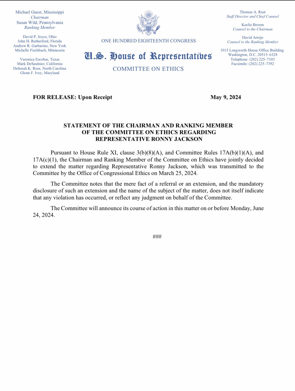 “Pursuant to House Rule XI, clause 3(b)(8)(A), and Committee Rules 17A(b)(1)(A), and 17A(c)(1), the Chairman and Ranking Member of the Committee on Ethics have jointly decided to extend the matter regarding Representative Ronny Jackson, which was transmitted to the Committee by the Office of Congressional Ethics on March 25, 2024. The Committee notes that the mere fact of a referral or an extension, and the mandatory disclosure of such an extension and the name of the subject of the matter, does not itself indicate that any violation has occurred, or reflect any judgment on behalf of the Committee. The Committee will announce its course of action in this matter on or before Monday, June 24, 2024” says the House Ethics Committee in a statement.