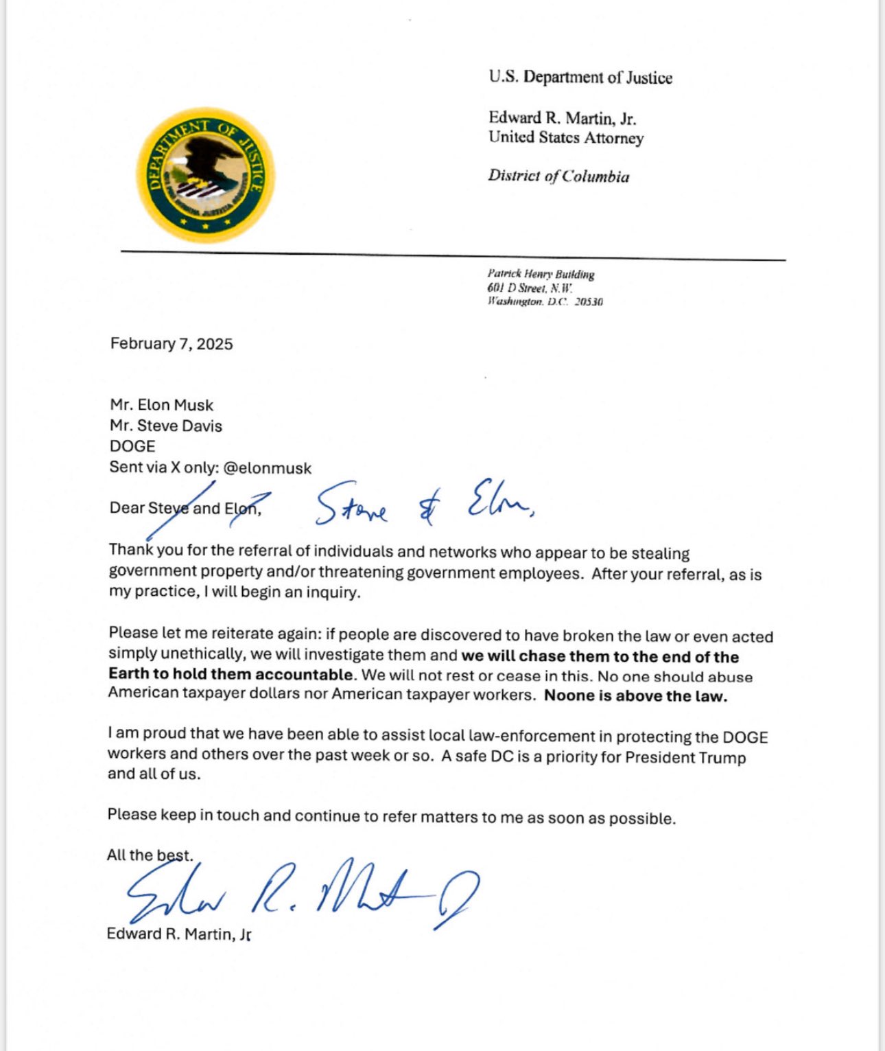 “Thank you for the referral of individuals and networks who appear to be stealing government property and/or threatening government employees. After your referral, as is my practice, I will begin an inquiry. Please let me reiterate again: if people are discovered to have broken the law or even acted simply unethically, we will investigate them and we will chase them to the end of the Earth to hold them accountable. We will not rest or cease in this. No one should abuse American taxpayer dollars nor American taxpayer workers. Noone is above the law. I am proud that we have been able to assist local law-enforcement in protecting the DOGE workers and others over the past week or so. A safe DC is a priority for President Trump and all of us. Please keep in touch and continue to refer matters to me as soon as possible,” writes Acting DC US Attorney ED Martin in another ballsucking missive to his overlord Elon Musk, apparently vowing to chase journalists to the ends of the earth for exposing that Musk put a racist freak in charge of the US Treasury’s code base.