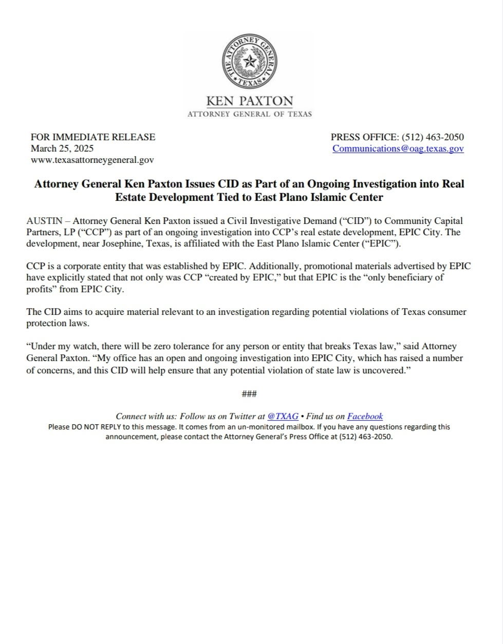 “Attorney General Ken Paxton issued a Civil Investigative Demand (‘CID’) to Community Capital Partners, LP (‘CCP’) as part of an ongoing investigation into CCP’s real estate development, EPIC City. The development, near Josephine, Texas, is affiliated with the East Plano Islamic Center (‘EPIC’). CCP is a corporate entity that was established by EPIC. Additionally, promotional materials advertised by EPIC have explicitly stated that not only was CCP ‘created by EPIC,’ but that EPIC is the ‘only beneficiary of profits’ from EPIC City. The CID aims to acquire material relevant to an investigation regarding potential violations of Texas consumer protection laws. ‘Under my watch, there will be zero tolerance for any person or entity that breaks Texas law,’ said Attorney General Paxton. ‘My office has an open and ongoing investigation into EPIC City, which has raised a number of concerns, and this CID will help ensure that any potential violation of state law is uncovered,'” says a press release from Picasso-faced Texas Attorney General Ken Paxton’s office after somebody fucked up and forgot to bribe him for what QAnon freak Lara Logan claims is an “Islamic mega city.”