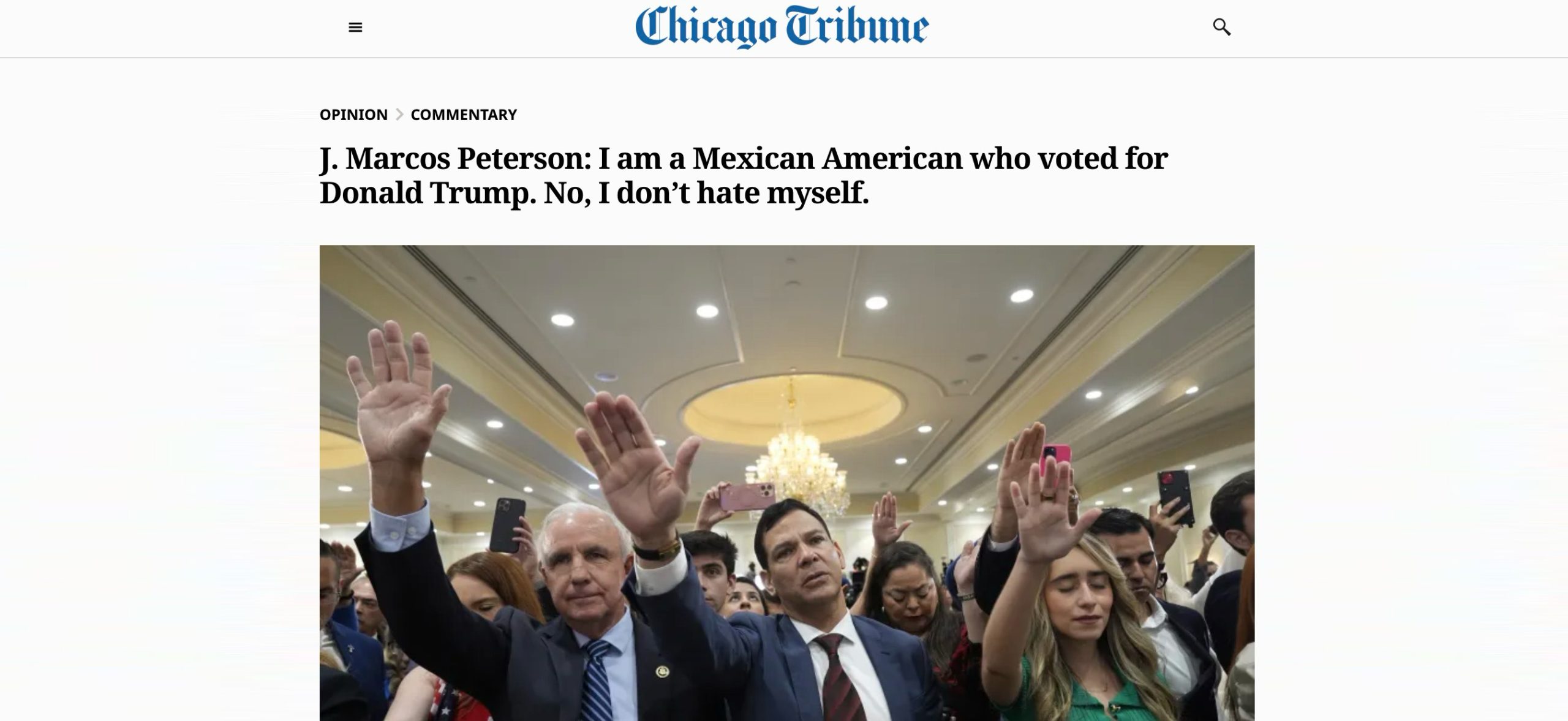 It’s a similar tune that gay Latino Chicagoan J Marcos Peterson who, in the days after the election, sang in an op-ed printed by the Tribune, writing that “Seeing my undocumented family members, who have been in the US for more than 20 years, work, pay taxes and buy their own homes with zero benefits, then watching millions of new migrants skip the line with government funded help, only enflamed me and other Latinos like me,” was his cue to vote MAGA and holy shit that sentence alone needs a full team of psychiatric PhDs working around the clock for years to crack the code of what the fuck is wrong with this guy. He actually wrote that to major newspaper and was serious.