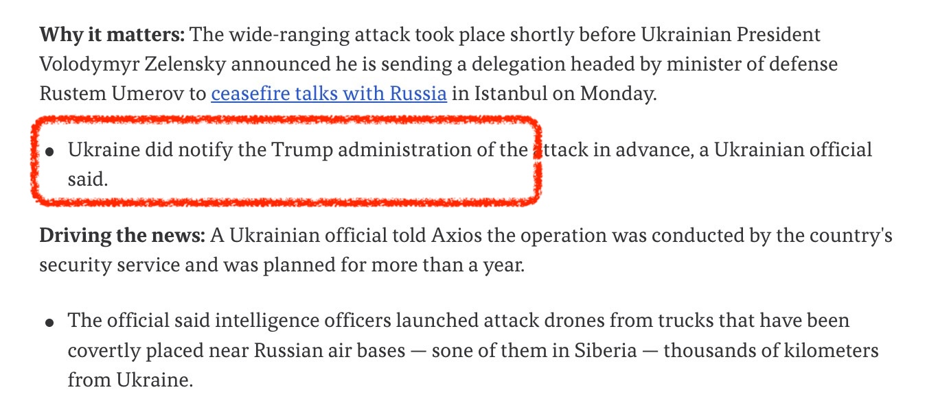 CORRECTION 6/1/2025 12:51 PM EDT: Axios fucked this up but did not actually note the mistake, simply appending “Editor’s note: This story has been updated with additional reporting.” The original version printed about an hour ago attributed a Ukrainian official when they wrote “Ukraine did notify the Trump administration of the attack in advance” in their story about the strikes, emphasis added.
