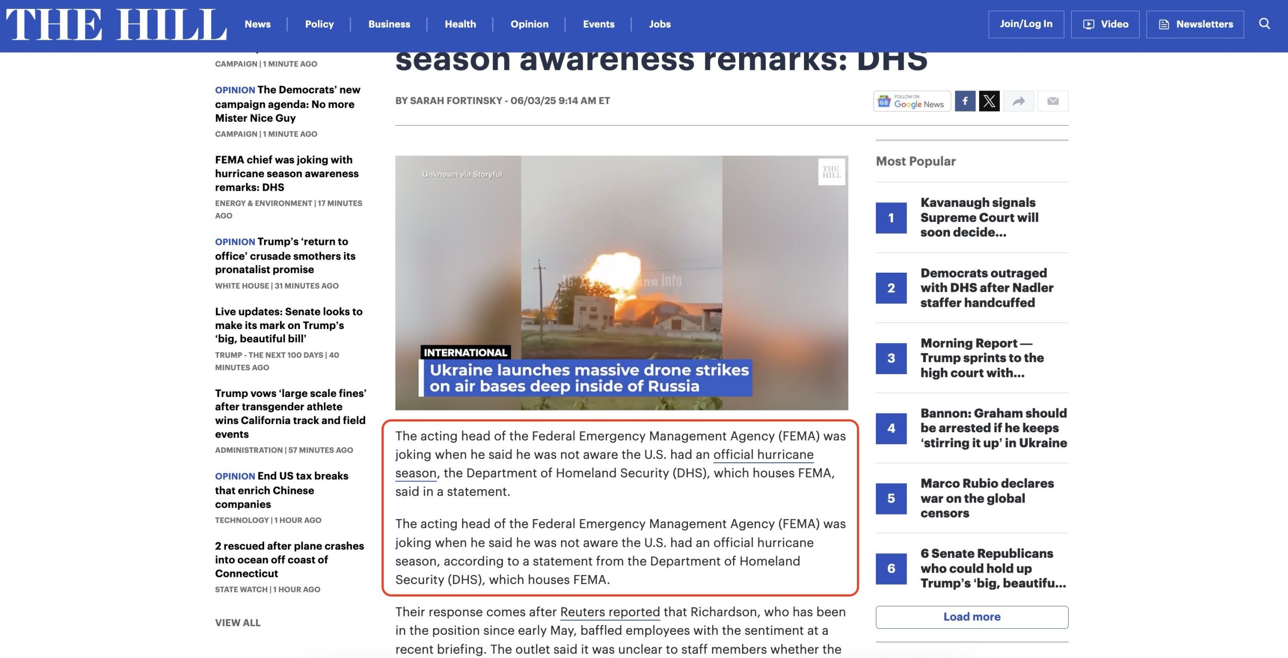“Their response comes after Reuters reported that Richardson, who has been in the position since early May, baffled employees with the sentiment at a recent briefing. The outlet said it was unclear to staff members whether the remark was meant to be taken ‘literally, as a joke, or in some other context,'” says the next paragraph, the AI engine or maybe Bangladeshi content farm laborer forgetting to include Acting FEMA Director David Richardson’s first name in the article-ish piece meant to be DHS’s response to staffers questioning his competence after the replacement for his too pro-FEMA predecessor made it clear to them he didn’t know hurricane season was a thing.