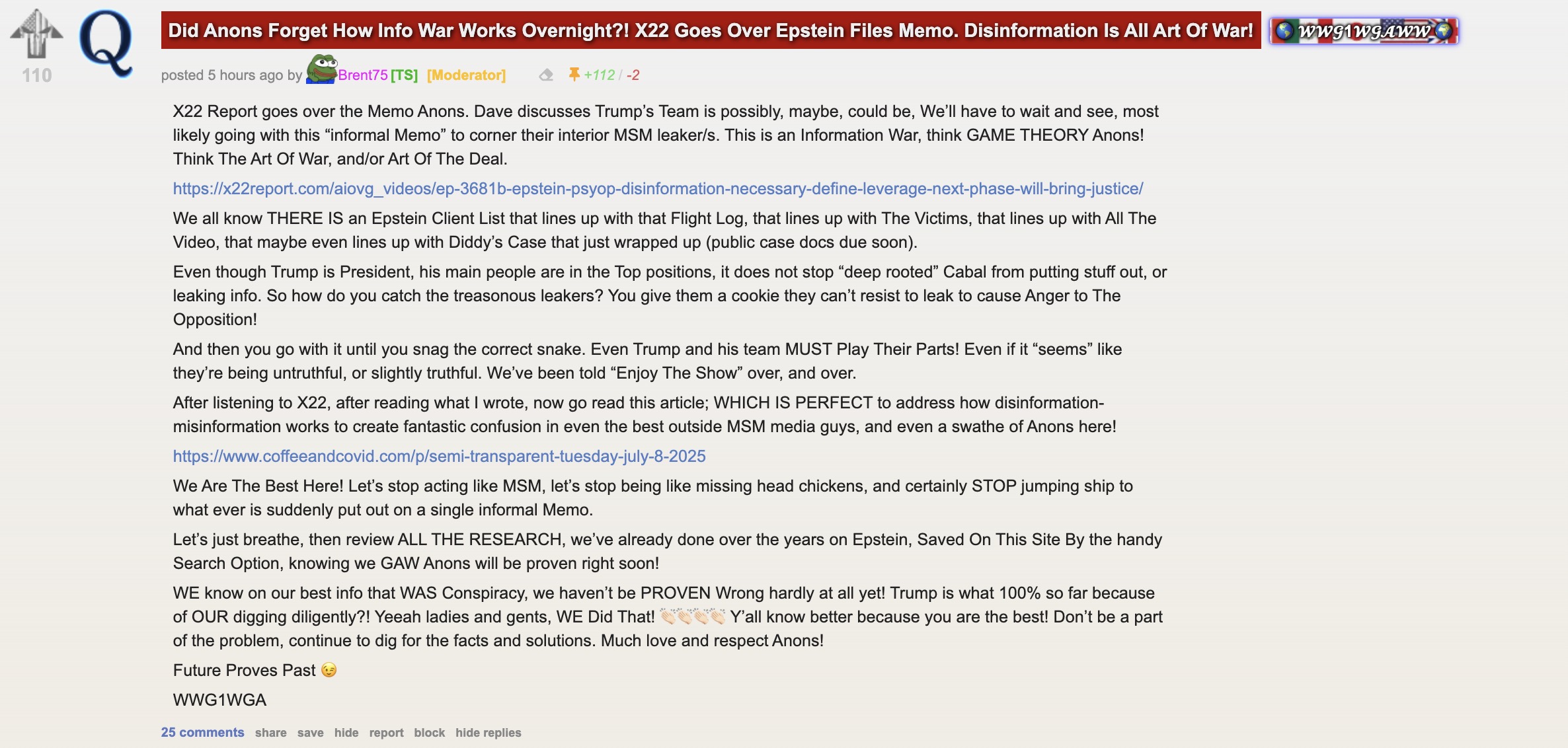 The top Tuesday post on QAnon fan site GreatAwakening.win and holy fuck it is so QAnon, lol.