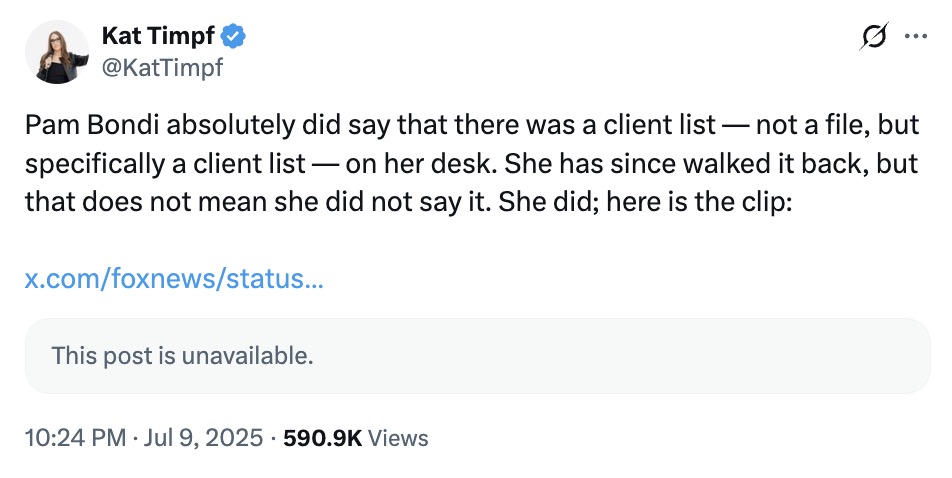 If you’re wondering why it says “x.com/foxnews/status…” where should be a clip of scumbag Attorney General Pam Bondi telling the MAGA propaganda network the Epstein client list was on her desk, it’s because they deleted it at some point in the 13 hours and 35 minutes since their anti-Trump Libertarian contributor Kat Timpf shared it – and about four months after they posted it.