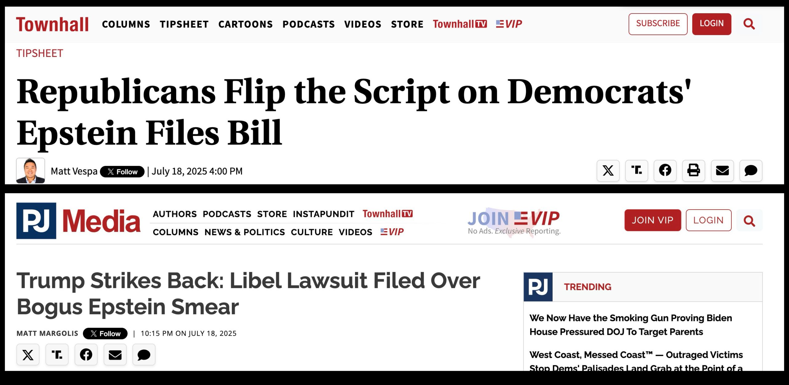 Lol at these assclowns writing their headlines from the same, unflipped script. Couldn’t fit them in above, despite the predictability of their narrative. First one first: “The difference between the Republican amendment and the one proposed by House Democrats is that it trashes documents that are unverified or knowingly false. If you wish, you can refer to this as the Steele Protocol – a guardrail against the dissemination of fake news, which would lead to further shambolic stories like the one published in The Wall Street Journal last night,” writes Townhall fanboy Matt Vespa.