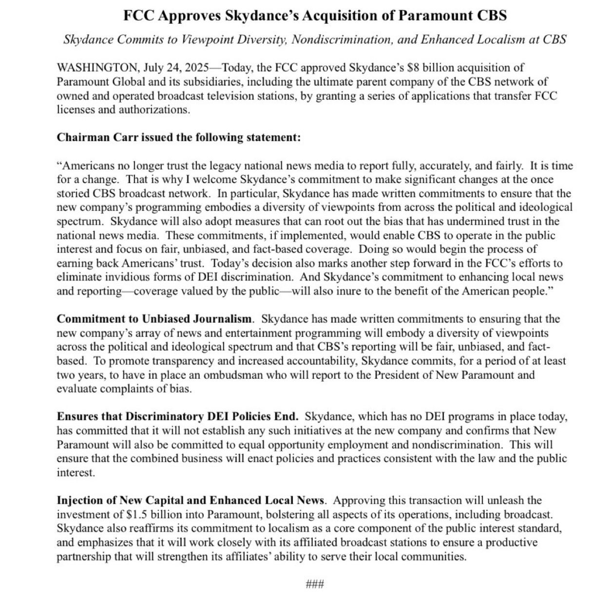 “Americans no longer trust the legacy national news media to report fully, accurately, and fairly. It is time for a change. That is why I welcome Skydance’s commitment to make significant changes at the once storied CBS broadcast network. In particular, Skydance has made written commitments to ensure that the new company’s programming embodies a diversity of viewpoints from across the political and ideological spectrum. Skydance will also adopt measures that can root out the bias that has undermined trust in the national news media. These commitments, if implemented, would enable CBS to operate in the public interest and focus on fair, unbiased, and fact-based coverage. Doing so would begin the process of earning back Americans’ trust. Today’s decision also marks another step forward in the FCC’s efforts to eliminate invidious forms of DEI discrimination. And Skydance’s commitment to enhancing local news and reporting-coverage valued by the public-will also inure to the benefit of the American people,” said FCC Nazi Brendan Carr in a statement that had absolutely fuck all to do with antitrust laws and everything to do with the regime’s cunty victimhood.