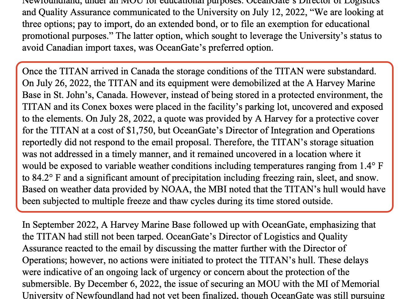 “The board also found OceanGate failed to properly investigate and address known hull anomalies following its 2022 Titanic expedition. Investigators determined Titan’s real-time monitoring system generated data that should have been analyzed and acted on during the expedition. However, OceanGate did not take any action related to the data, conduct any preventative maintenance or properly store the Titan during the extended off season before its 2023 Titanic expedition.”