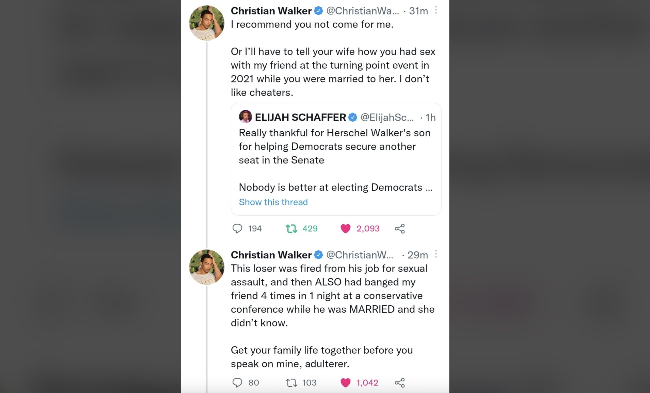 “But Spartan, what about Christian Walker? And what else is Elijah Schaffer’s role here besides commenting positively on an image of a finger being ensconced in a foreign object?”