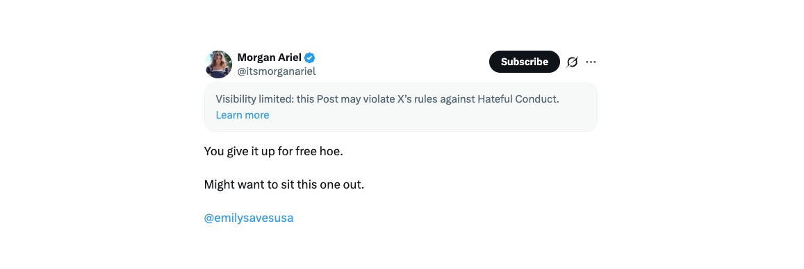 Let’s just skip the screenshot for Morgan’s reply, also throttled due to extreme toxicity: “You suck black dick and probably have aids.” Which Pearl then promptly denied half of: