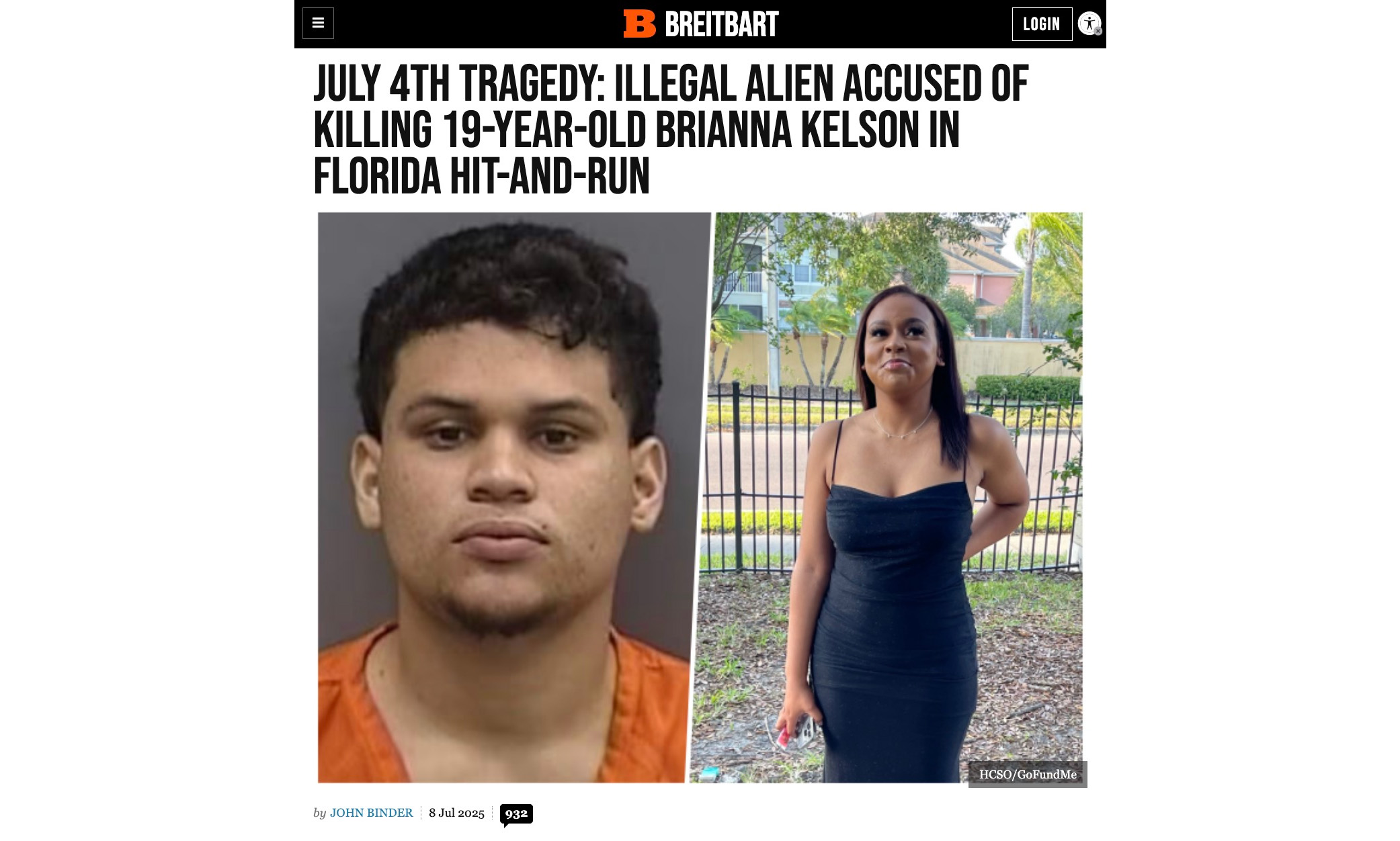 Sure doesn’t seem like it. Breitbart was actually a day late on ascertaining the identity of 19 year-old Brianna Kelson, who was killed when 21 year-old Roberto Carlos Meza Rosales ran a red light and plowed into her car as she was driving to work at a Wendy’s at 5 AM on the 4th of July, per the Tampa Bay Times’s July 7th reporting. Rosales fled and was arrested at his apartment later that day.
