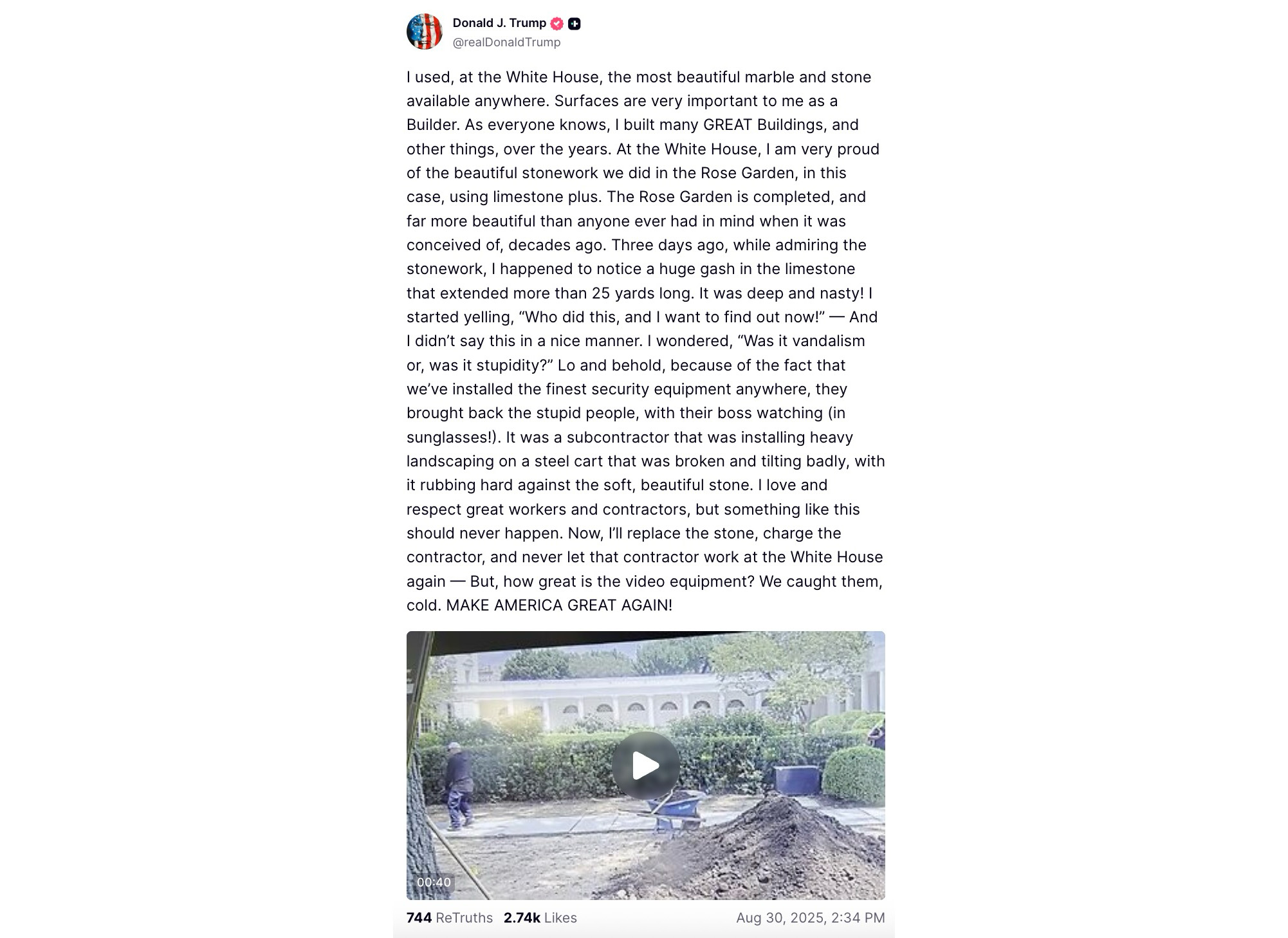 “I used, at the my house, the most beautiful marble and stone available anywhere. Surfaces are very important to me as a Builder. As everyone knows, I built many GREAT Buildings, and other things, over the years. At my house, I am very proud of the beautiful stonework we did in the Daisy Garden, in this case, using limestone plus. The Daisy Garden is completed, and far more beautiful than anyone ever had in mind when it was conceived of, decades ago. Three days ago, while admiring the stonework, I happened to notice a huge gash in the limestone that extended more than 25 yards long. It was deep and nasty! I started yelling, ‘Who did this, and I want to find out now!’ – And I didn’t say this in a nice manner. I wondered, ‘Was it vandalism or, was it stupidity?'”
