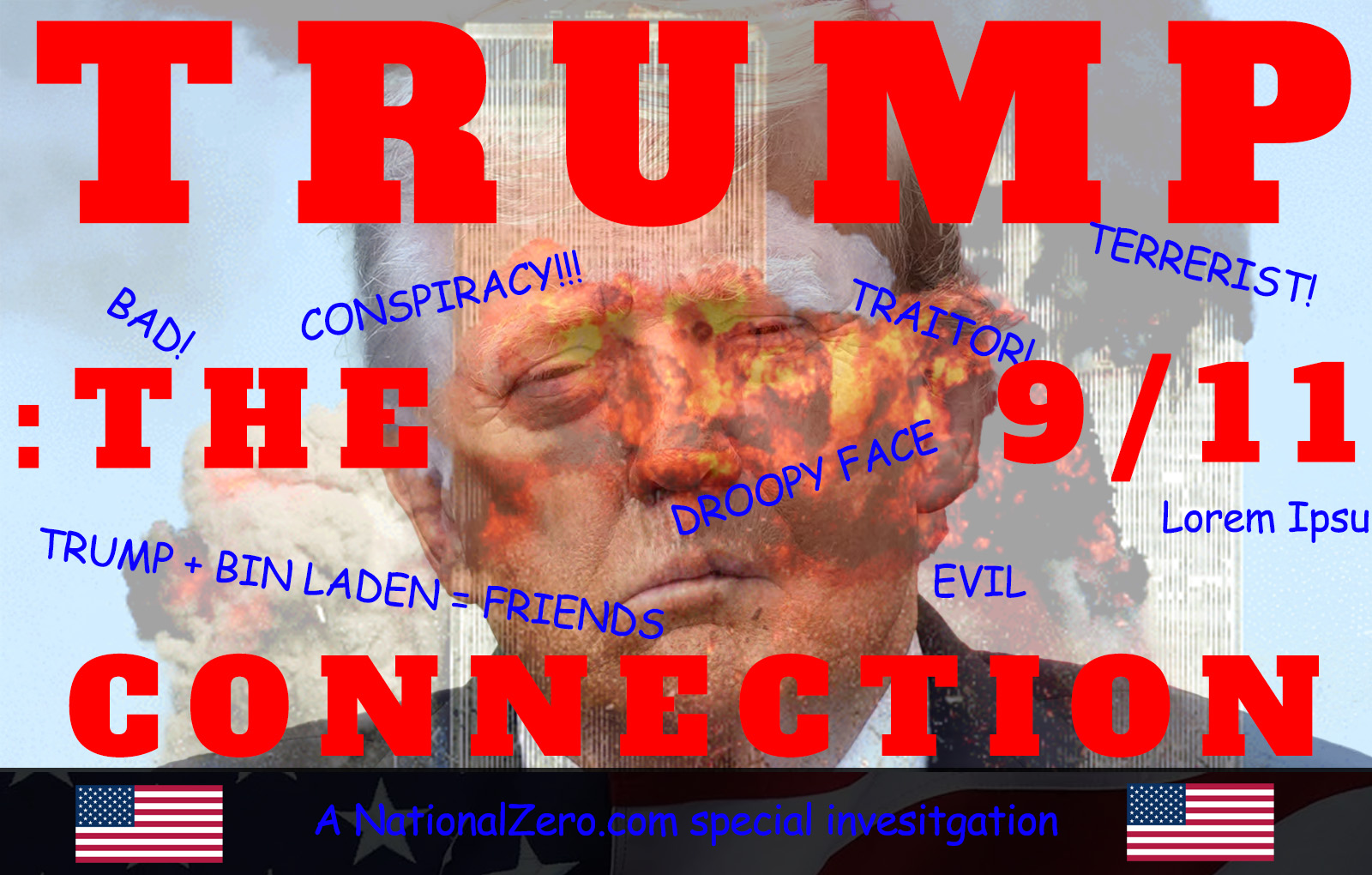 Had all these plans for a “Trump was secretly behind 9/11 attacks” satire and even went so far as to create the intentionally amateurish header image to color inside the lines of usage law because man did the fat slob look like he had a transient ischemic attack or something this morning.