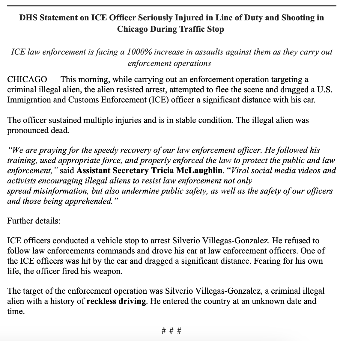 “ICE officers conducted a vehicle stop to arrest Silverio Villegas-Gonzalez. He refused to follow law enforcements commands and drove his car at law enforcement officers. One of the ICE officers was hit by the car and dragged a significant distance. Fearing for his own life, the officer fired his weapon. The target of the enforcement operation was Silverio Villegas-Gonzalez, a criminal illegal alien with a history of reckless driving. He entered the country at an unknown date and time.”