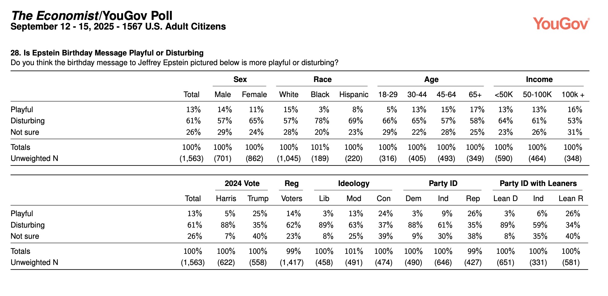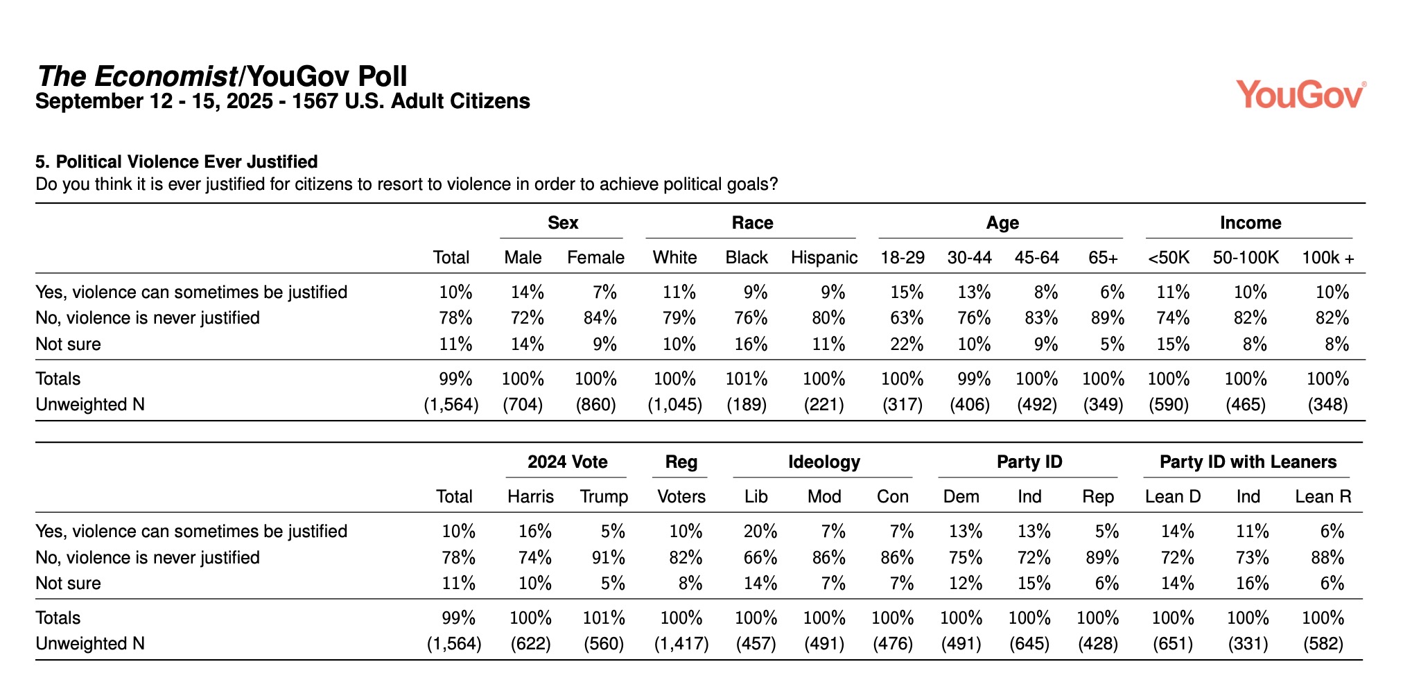 This week’s YouGov/Economist national survey, conducted Thursday through Monday and thus entirely after the assassination of Charlie Kirk, asked respondents the very timely and appropriate question of “Do you agree or disagree with the following statement? ‘I think it’s worth it to have a cost of, unfortunately, some gun deaths every single year so that we can have the Second Amendment to protect our other God-given rights,'” to which just 30 percent of respondents overall said they agree to 52 percent saying they disagreed, and 19 percent were unsure.