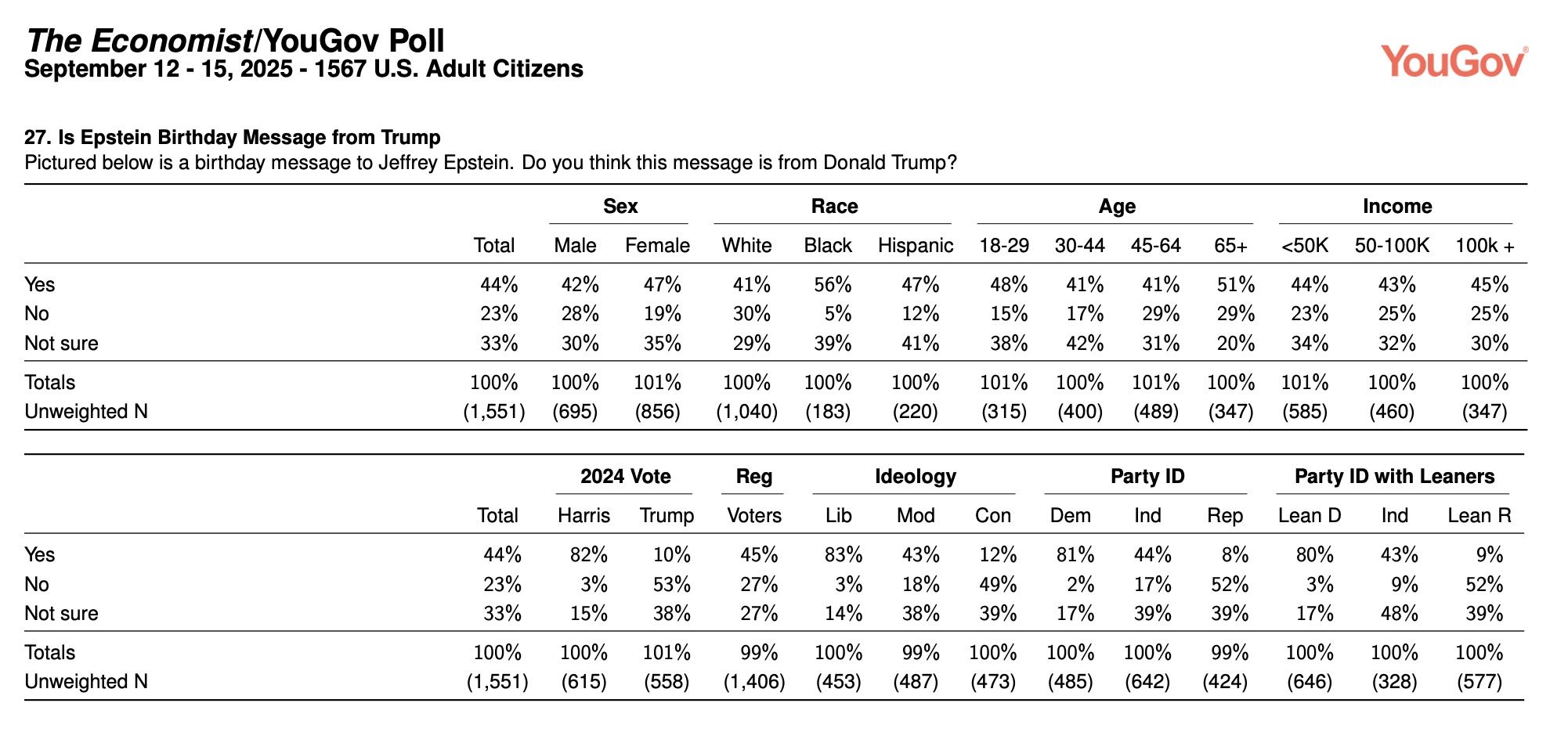 Among Trump 2024 voters 55 percent agreed, 26 percent disagreed, and 19 percent were unsure while just 11 percent of former Vice President Kamala Harris’s voters agreed versus 81 percent disagreeing and 8 percent unsure. Now maybe these questions can only be so long due to space limitations and/or it’s simply prudent polling to keep them as short as possible but the context of the quote might’ve been useful. At the very least maybe YouGov could’ve A/B tested a subsample with another version of the question mentioning that Kirk said it at a 2023 TPUSA event held just days after three schoolchildren and three teachers were massacred at the Covenant School in Nashville.