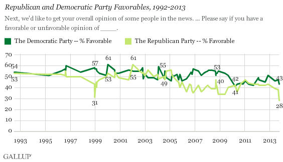 A lot of pundits are pointing out how Tuesday is 12 years to the day exactly since the last time the opposition party was hours away from forcing a government shutdown over Obamacare. Funny enough Gallup measured the popularity of the two parties that week and here’s what they found: