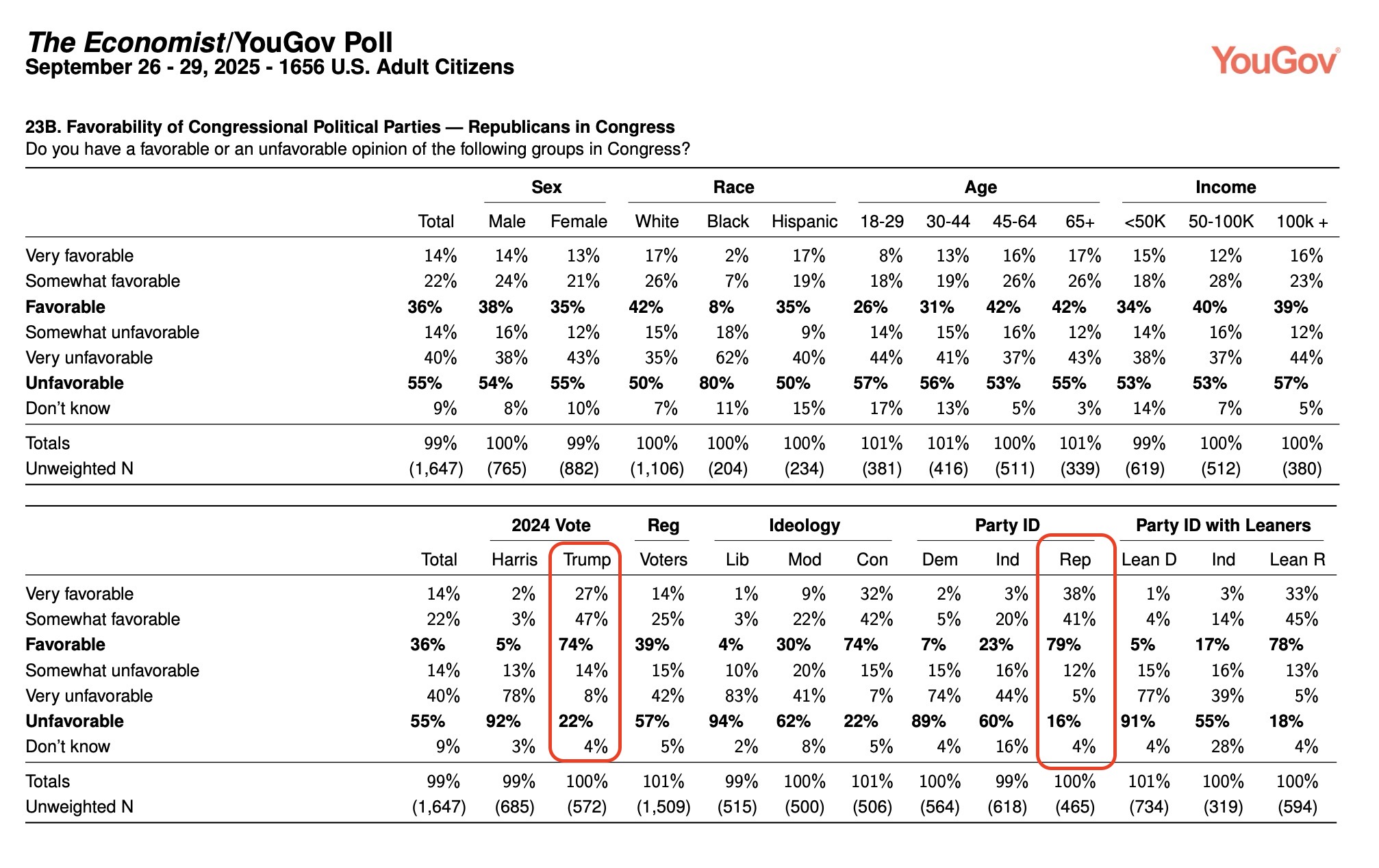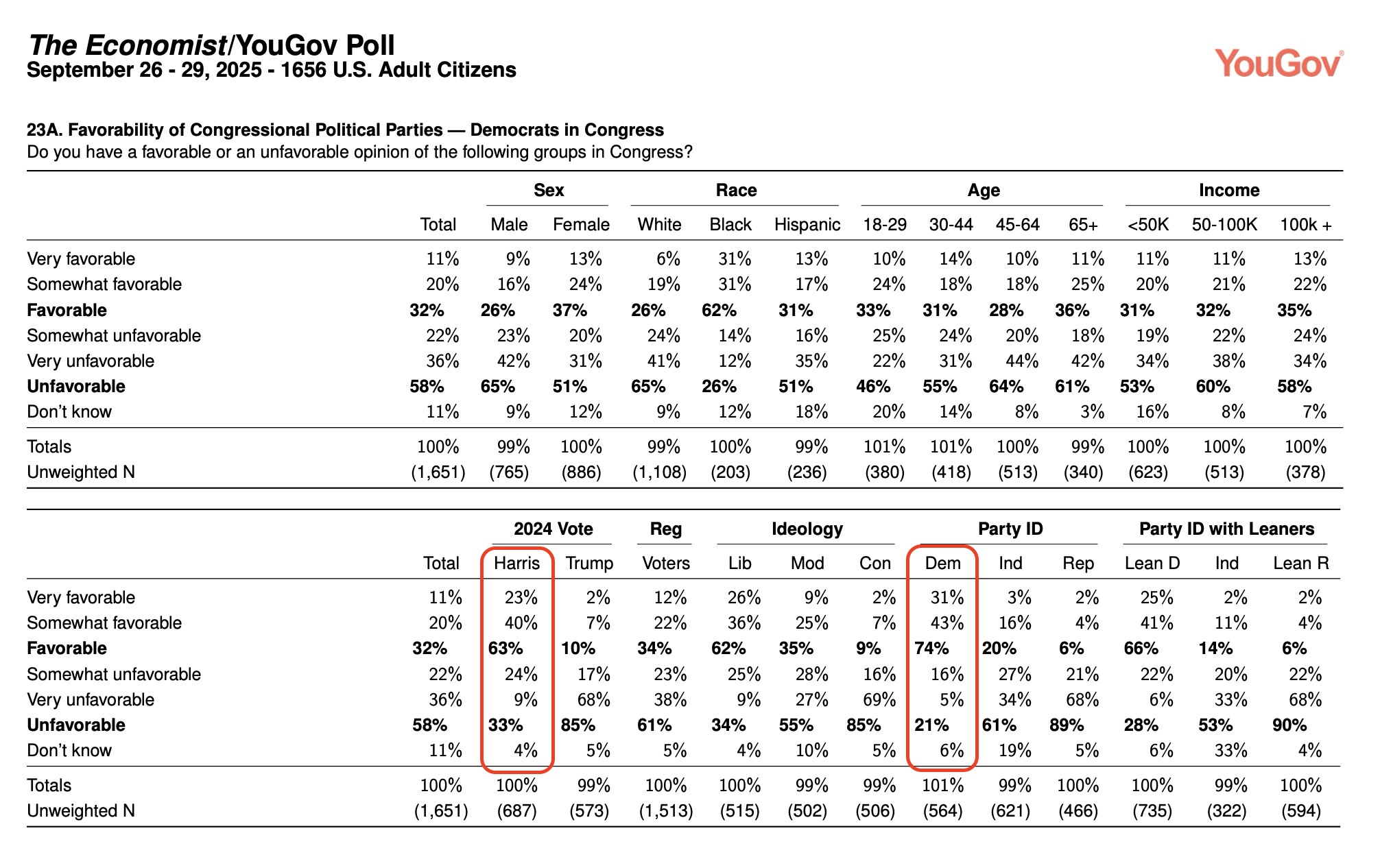 The gap between approvers/disapprovers of each party among their identified members is similar to the overall delta, but among the respective voters of each 2024 candidate well, you can see the disappointment with the pretty feckless, impotent “leadership” of Chuck Schumer and Hakeem Jeffries right here in front of you in black and white – which is really the only reason there’s a difference between the approval of elected Democrats and Republicans at all these days.