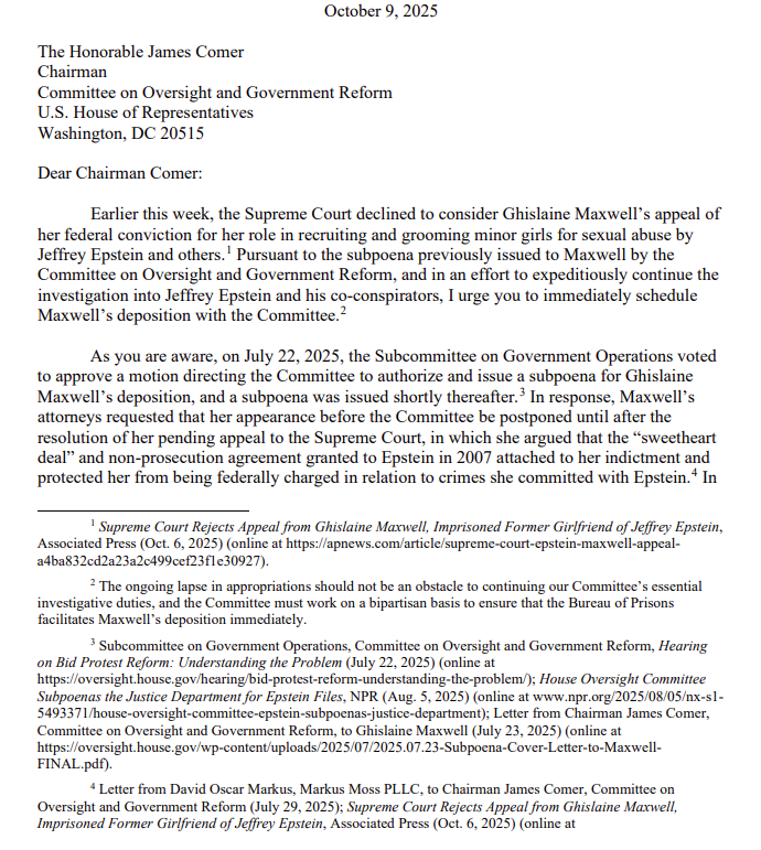 “Earlier this week, the Supreme Court declined to consider Ghislaine Maxwell’s appeal of her federal conviction for her role in recruiting and grooming minor girls for sexual abuse by Jeffrey Epstein and others. Pursuant to the subpoena previously issued to Maxwell by the Committee on Oversight and Government Reform, and in an effort to expeditiously continue the investigation into Jeffrey Epstein and his co-conspirators, I urge you to immediately schedule Maxwell’s deposition with the Committee,” writes top House Oversight Dem Robert Garcia in a letter to Chairbilly James Comer.