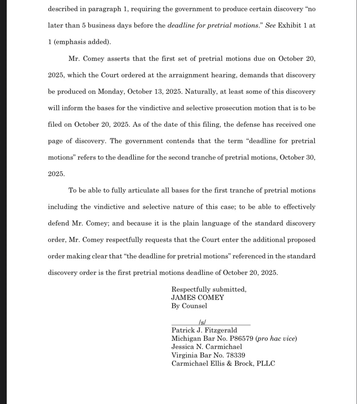 “Mr Comey asserts that the first set of pretrial motions due on October 20, 2025, which the Court ordered at the arraignment hearing, demands that discovery be produced on Monday, October 13, 2025. Naturally, at least some of this discovery will inform the bases for the vindictive and selective prosecution motion that is to be filed on October 20, 2025. As of the date of this filing, the defense has received one page of discovery. The government contends that the term ‘deadline for pretrial motions’ refers to the deadline for the second tranche of pretrial motions, October 30, 2025.”