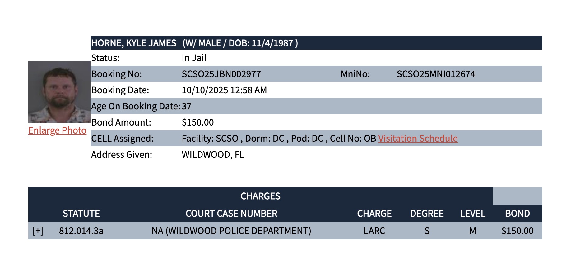 A Villages, Florida-area Trump fanboy is currently being held at the Sumter County Jail on $150 bond after he was arrested on a theft charge over a $15.50 bar tab he was unable to pay Thursday night at Gator’s Dockside at Brownwood, Villages-News reports. According to a police report, 37 year-old Kyle James Horne, who likes posting men’s rights memes like “Keeping a MAN away from his KIDS because of a FAILED RELATIONSHIP is CHILD ABUSE in disguise,” on Facebook, first ran into trouble when he claimed he left his wallet at home upon being confronted over the unpaid tab.