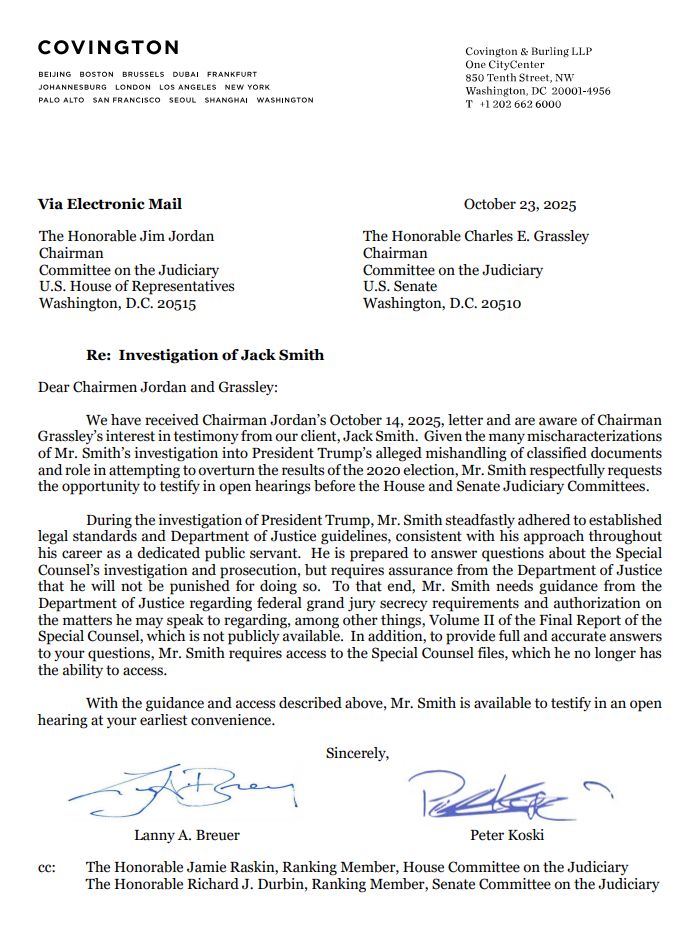 “We have received Chairman Jordan’s October 14, 2025, letter and are aware of Chairman Grassley’s interest in testimony from our client, Jack Smith. Given the many mischaracterizations of Mr Smith’s investigation into President Trump’s alleged mishandling of classified documents and role in attempting to overturn the results of the 2020 election, Mr Smith respectfully requests the opportunity to testify in open hearings before the House and Senate Judiciary Committees.”