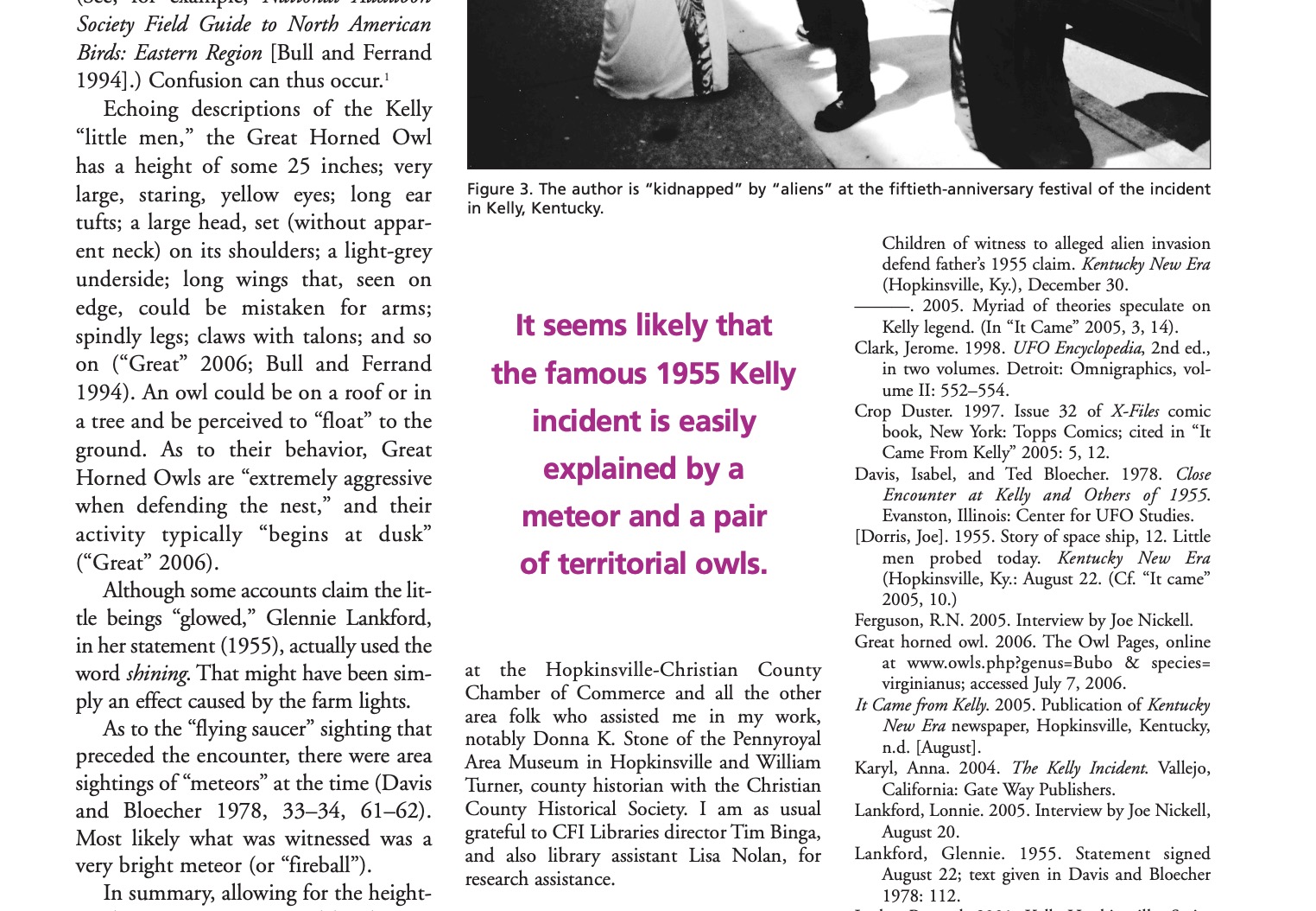 In summary, allowing for the heightened expectation prompted by the earlier “flying-saucer” sighting, and for the effects of excitement and nighttime viewing, it seems likely that the famous 1955 Kelly incident is easily explained by a meteor and a pair of territorial owls.