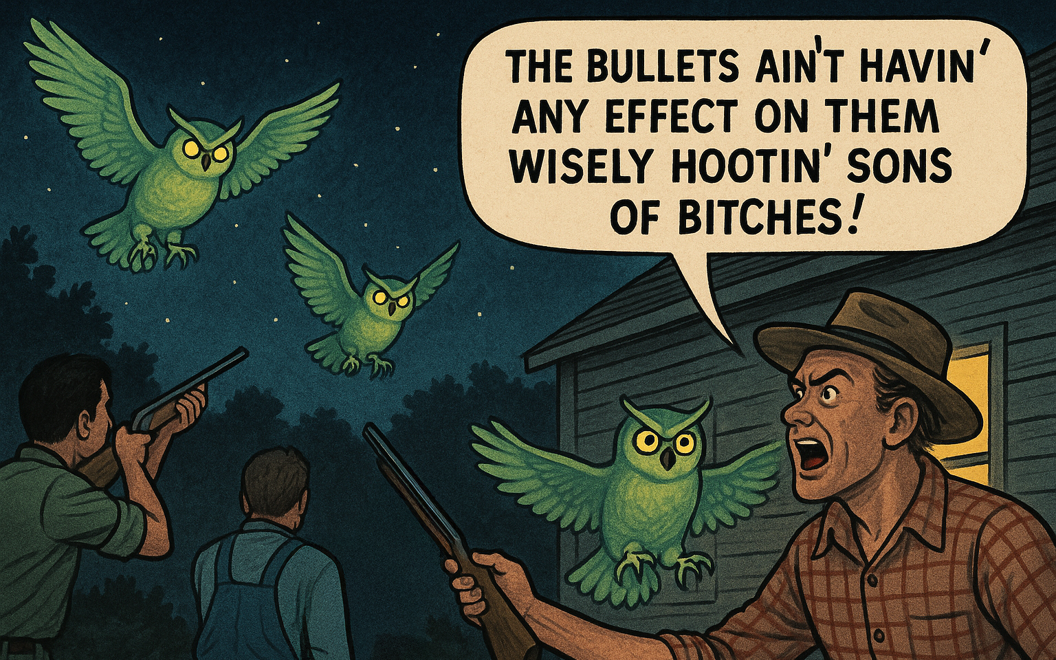 It’s up to you as to whether or not the Suttons were credible. Or the cops who investigated the scene – and notably did not include any details about the corpses of freshly shot owls littering the property in their report. You do not have to actually believe that aliens with large ears landed in Kentucky and proceeded to terrorize folks whose descendants are extremely likely to be MAGA voters. If you are uncomfortable with the idea of a literal alien invasion (albeit one of limited scope) having taken place in rural Kentucky in 1955 you can just shrug and say “I don’t know” and then go about your day. There’s no shame in simply disengaging from what is obviously a fraught proposition. This is asking a lot of you to entertain in what’s already a fucked up world.