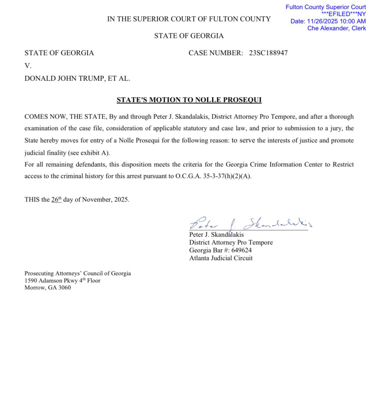 “COMES NOW, THE STATE, By and through Peter J Skandalakis, District Attorney Pro Tempore, and after a thorough examination of the case file, consideration of applicable statutory and case law, and prior to submission to a jury, the State hereby moves for entry of a Nolle Prosequi for the following reason: to serve the interests of justice and promote judicial finality (see exhibit A). For all remaining defendants, this disposition meets the criteria for the Georgia Crime Information Center to Restrict access to the criminal history for this arrest pursuant to OCGA 35 – 3 – 37(h)(2)(A),” writes Peter J Skandalakunt, the prosecutor who appointed himself to replace Fani Willis in the case against the Orange Tyrant and his minions over the post 2020-election coup attempt in the Peach State.