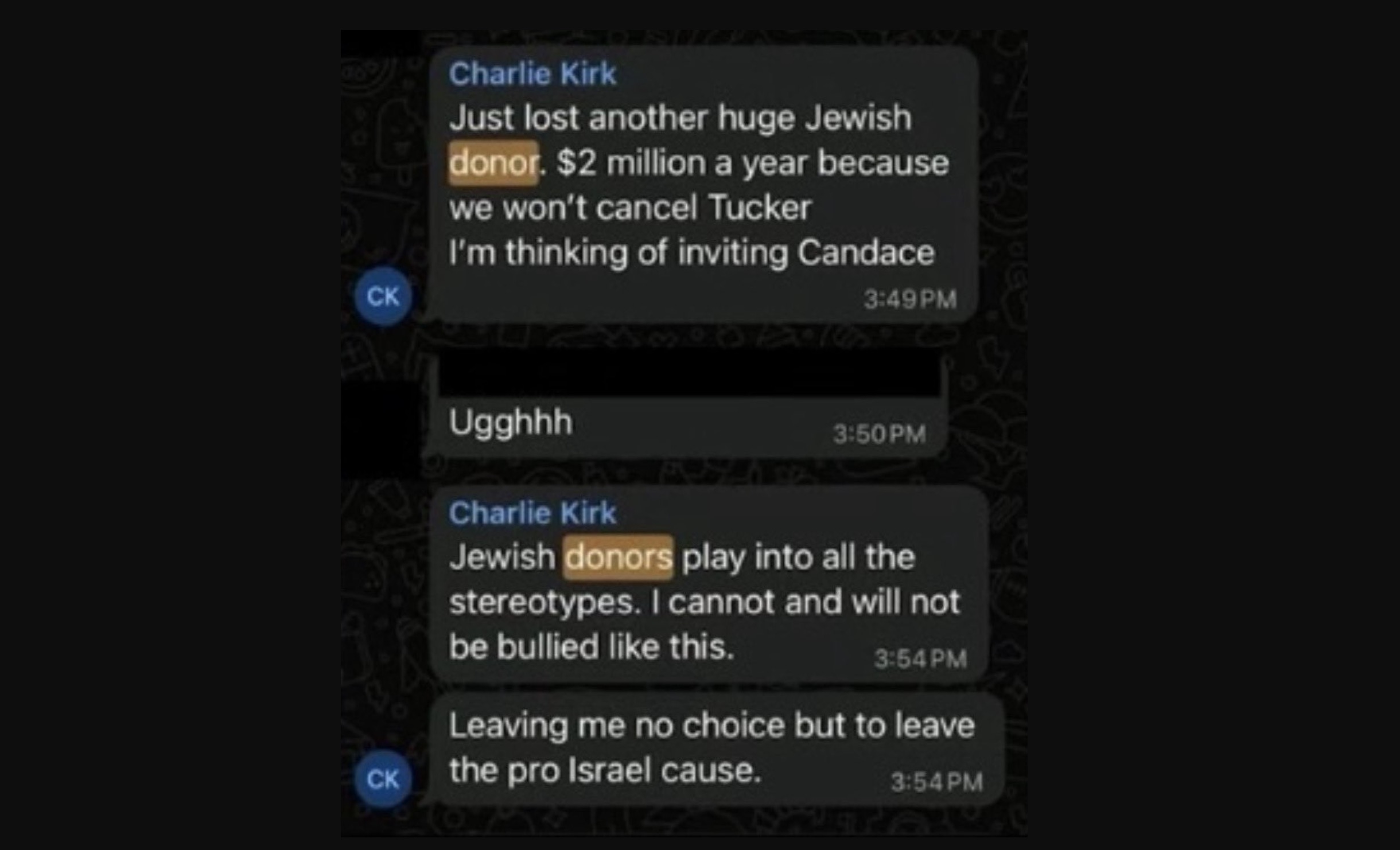 Sure seems like he was getting closer to where some of Kirk’s most prominent fellow right wing grifters are now, as in not really pretending anymore, at all, particularly the one who leaked those confirmed-to-be-authentic messages to help further her own narrative that Israel (and France) had ordered the hit on Charlie for his then-private “turning point”: Candace Owens.