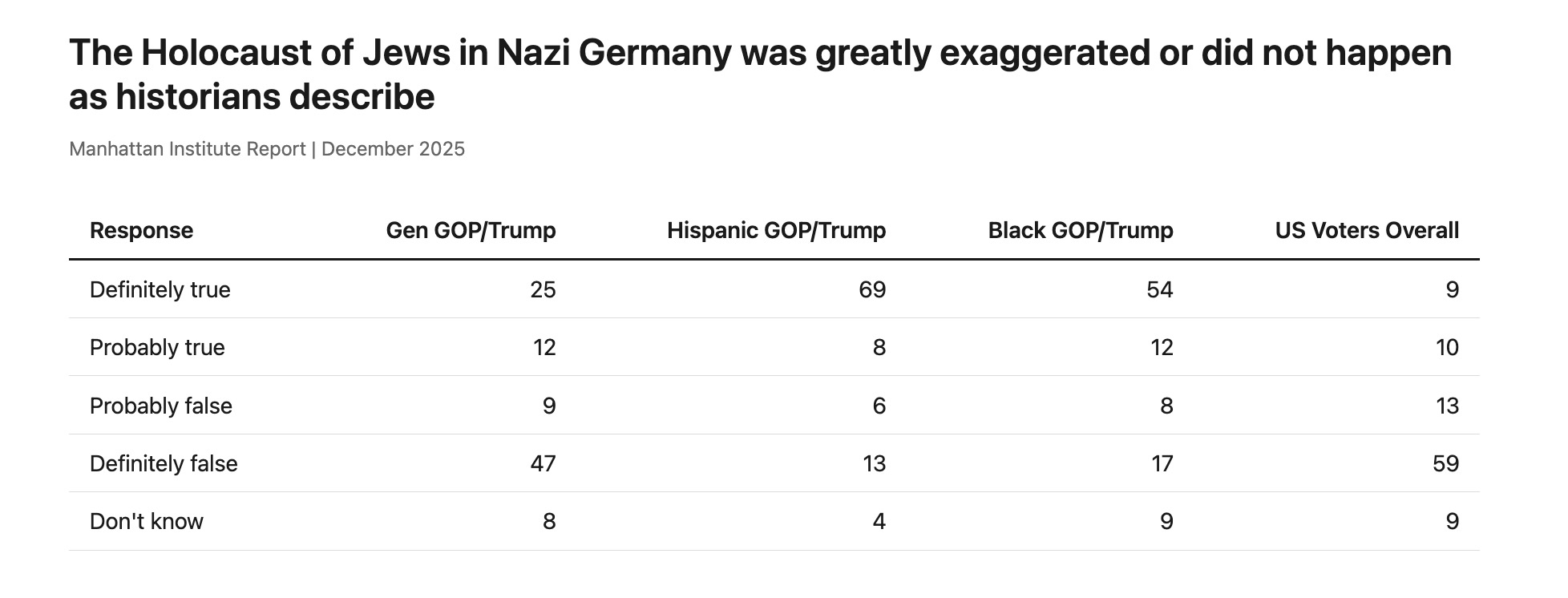 So 37 percent of “registered voters who are registered as Republican and/or voted for Trump in 2024” think it’s definitely/probably true that the Holocaust was exaggerated. It was probably this finding from their own polling that prompted the Manhattan Institute to hold the focus group.