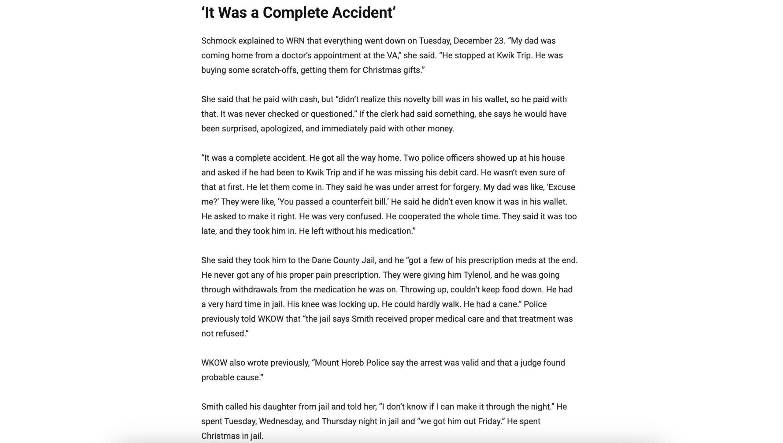 “On 12/23/25 Fred Smith was wrongfully charged and arrested for using ‘counterfeit money’ at Kwik Trip. But what actually happened is that Fred had a novelty $100 bill that was not at all an attempt at being a fake $100, mixed in with his other cash and debit card. He left that along with his debit card (which had more than enough to cover his bill). Kwik Trip failed to authenticate the money he used then proceeded to call the cops and officers arrived to Fred’s house and arrested him,” says the intro to the currently paused GoFundMe campaign headlined “Support Fred Smith’s Fight Against Injustice,” launched by the family of the 75 year-old Blue Mounds, Wisconsin resident and Purple Heart-recipient Vietnam combat vet who paid for his lottery scratch-offs with a “novelty” $100 bill.