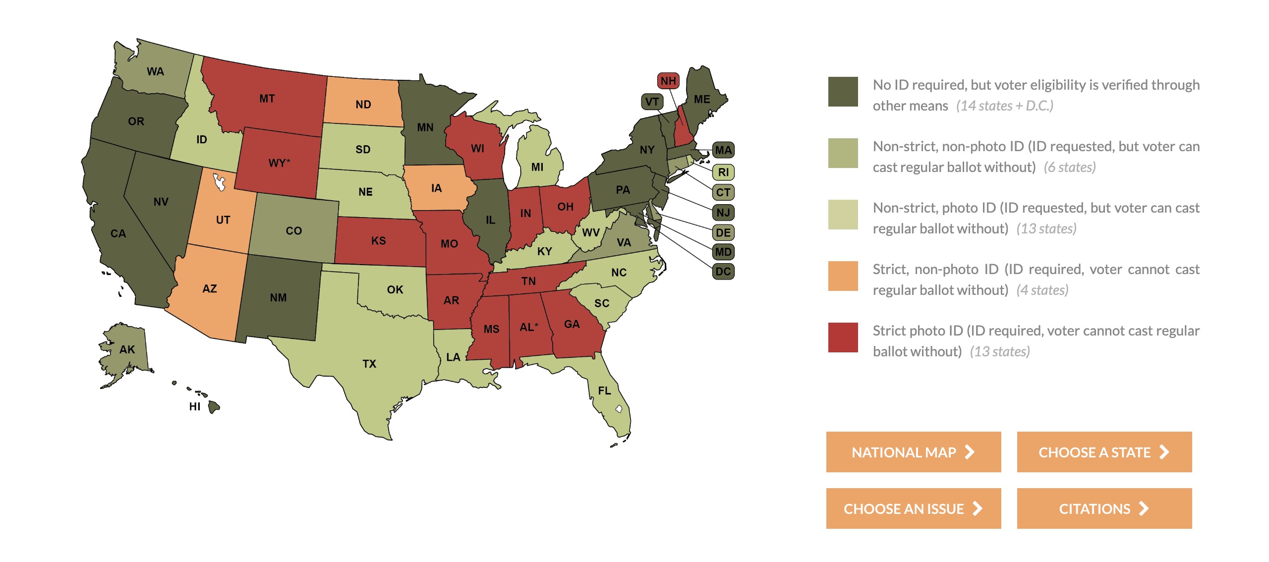 Yes, the stricter states correlate to redder ones and the looser states correlate to bluer ones but the way both Democrats and Republicans make it sound you would think that nobody’s ever won a goddamned election in a state whose voter ID laws are arrayed against the respective national party’s position on the issue… More simply Oklahoma sure as hell does not have a Dem governor, Senator, much less even a single US House member, nor does New Hampshire have a single Republican representing the state in either chamber of Congress and Gov Kelly Ayotte is a “RINO.”