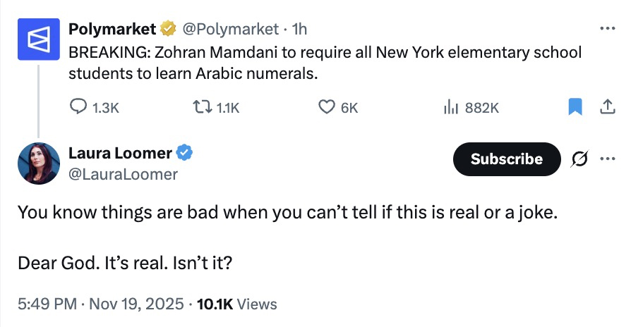It’s fair to question whether MAGA-friendly crypto betting circlejerk Polymarket was actually joking with the first tweet, which is still up. They may not have been because they’re not a satire operation.