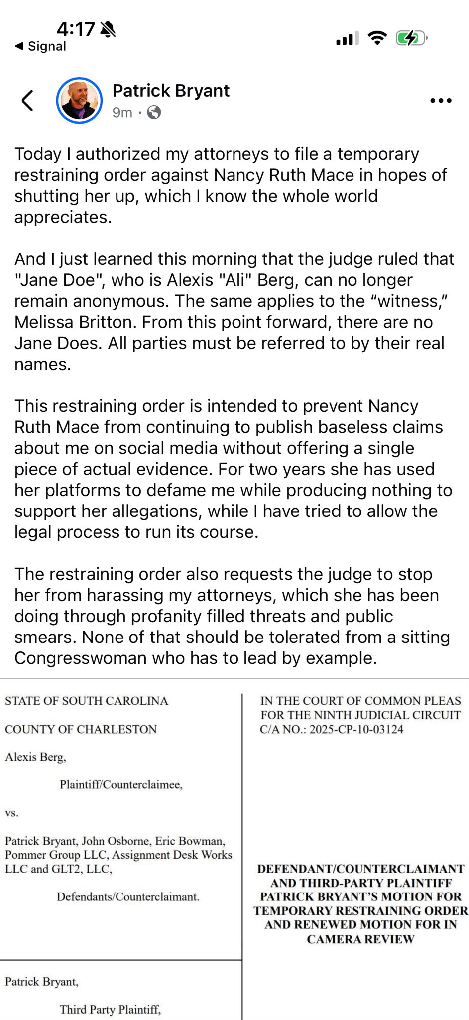 “Today I authorized my attorneys to file a temporary restraining order against Nancy Ruth Mace in hopes of shutting her up, which I know the whole world appreciates. And I just learned this morning that the judge ruled that ‘Jane Doe’, who is Alexis ‘Ali’ Berg, can no longer remain anonymous. The same applies to the ‘witness,’ Melissa Britton. From this point forward, there are no Jane Does. All parties must be referred to by their real names,” wrote Patrick Bryant on Facebook Monday.