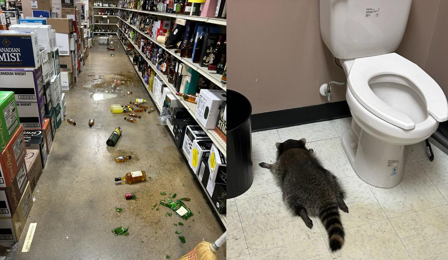 Yeah there’s not really any like bigger political picture or comment on the media or furious editorializing on the state of American society to be found here in this story sourced from a Tuesday Facebook post by the Hanover County, Virginia Animal Protection and Shelter. A raccoon somehow broke into a state-owned liquor store in the town of Ashland late Friday/early Saturday, knocked over a dozen or two bottles of what appears to be gin, vodka, and other various spirits, licked some of it off the floor, got fucked up, and hilariously passed out in the restroom next to the toilet as though he was trying to vomit. The cop who responded took these excellent pics and brought the self-tranquilized animal to the shelter to sleep the libations off while vets examined him. Finding no injuries or disease, they then released him back into the wild at an undisclosed location.