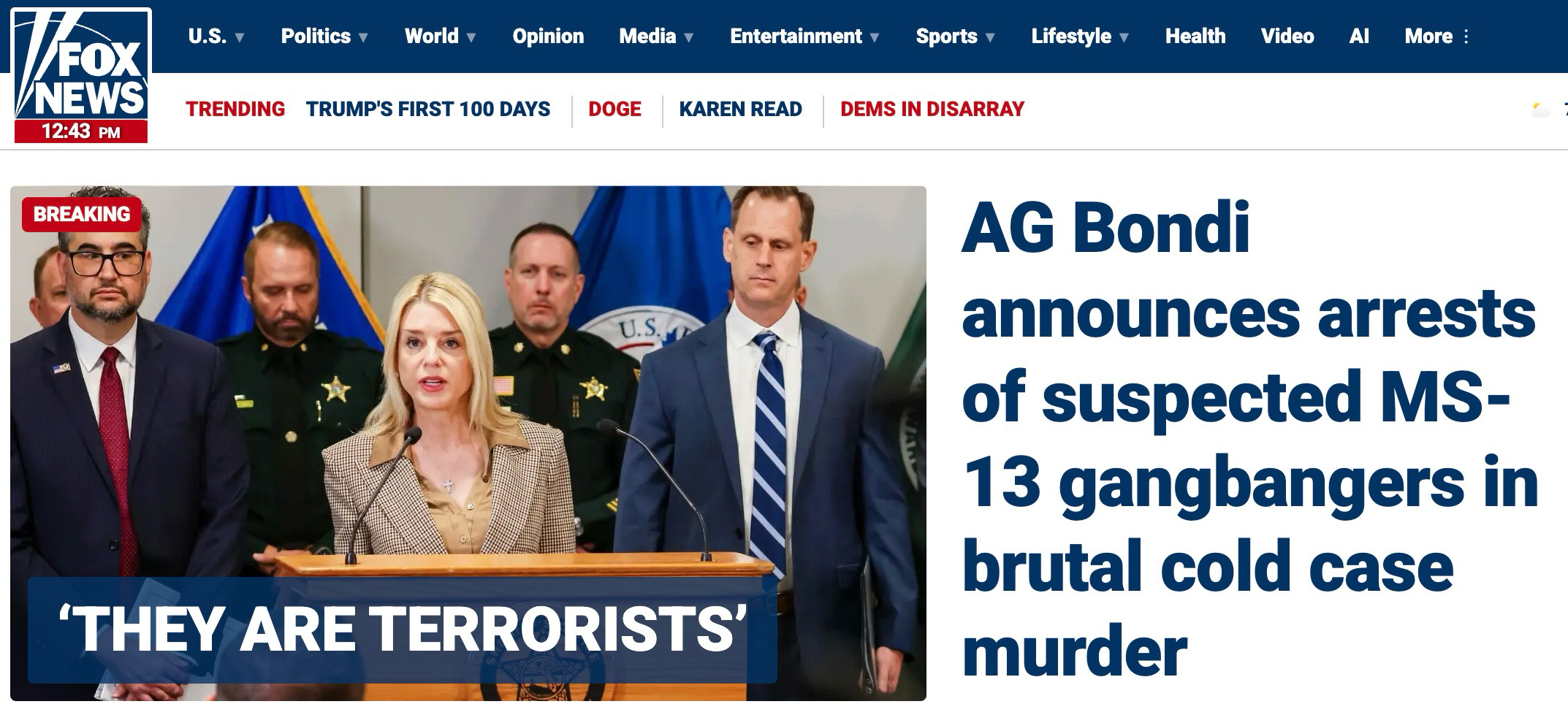 FoxNews.com at 12:43 PM EDT on April 4, 2025, the same moment the Dow Jones Industrial Average was down 1,541.27 points, or 3.80 percent, the S&P down 210.62 points, or 3.90 percent, and the Nasdaq down 644.64 points, or 3.89 percent the subliminal message apparently being “THE DECLINE TO YOUR 401K IS THE COST OF DEFEATING MS-13 AND FREEDOM AND SHIT.”